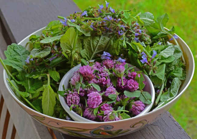 Two other wild foods that required a bit more effort to harvest today were red clover (Trifolium pratense) and lyre-leaf sage (Salvia lyrata). Because my husband was going to mow our front field, I did a walk-through to see if there was anything I wanted to rescue first. I found lyre-leaf sage growing in abundance and red clover showing its first blooms.